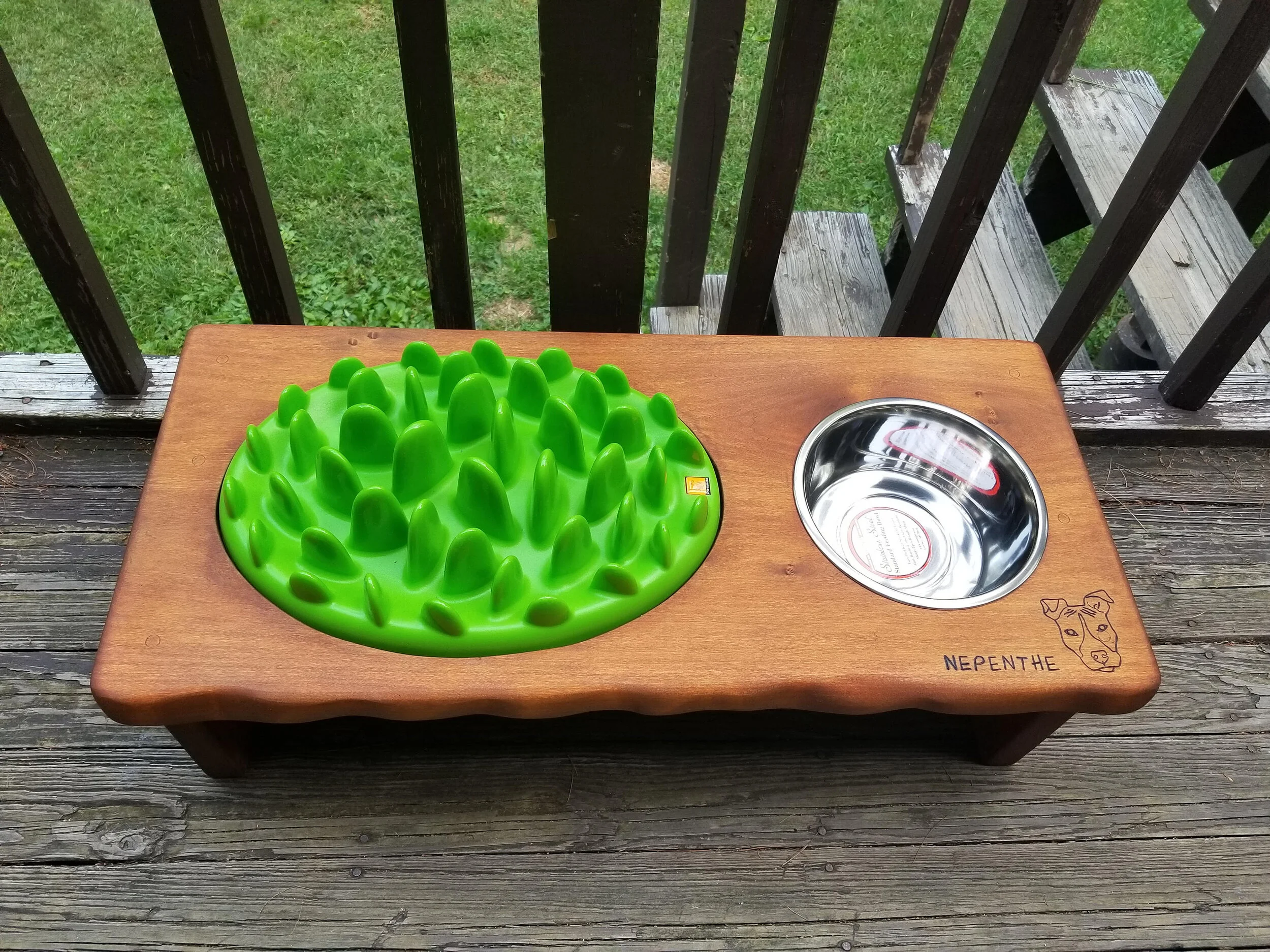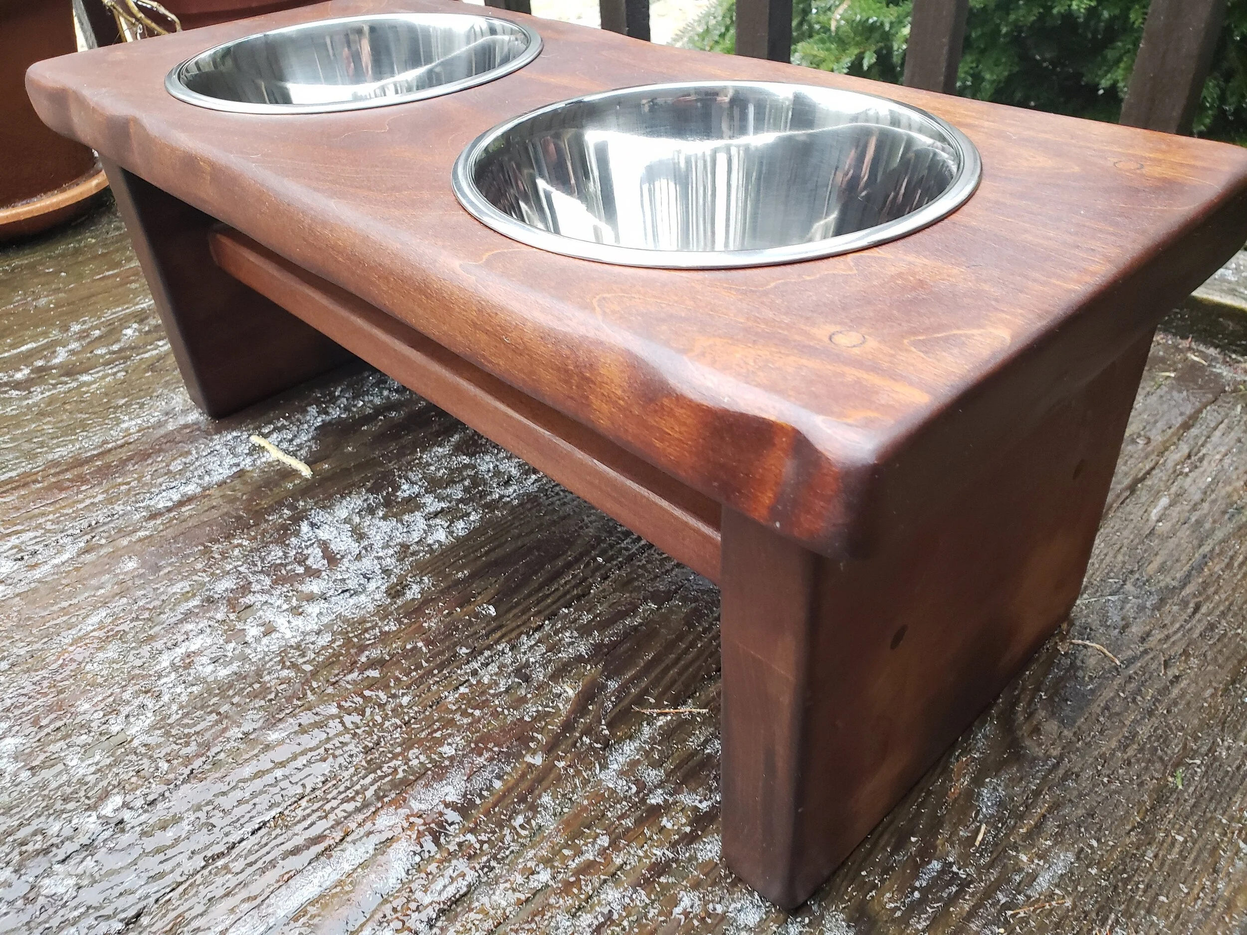 These raised dog and/ or cat feeders are handcrafted by us from solid poplar wood with a hand-rubbed oil finish; prepared in Mocha Stained Poplar finish.