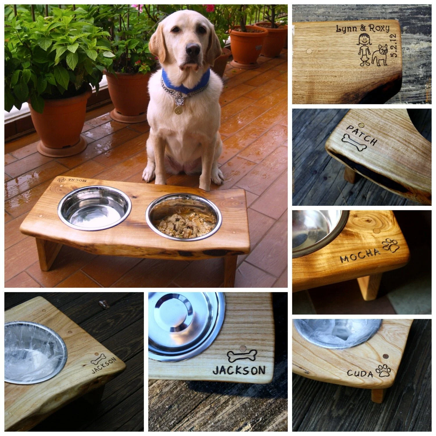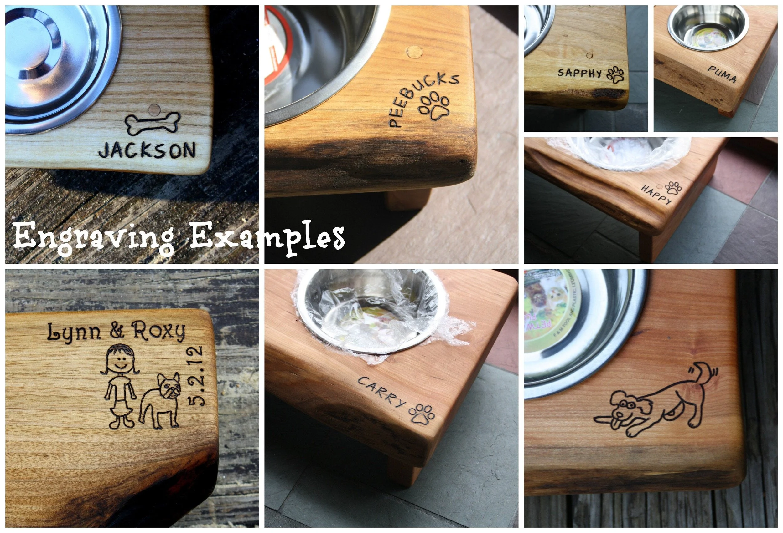 These are available in multiple sizes and bowl configurations, with hand engraved personalization included, and comes with stainless steel bowls.