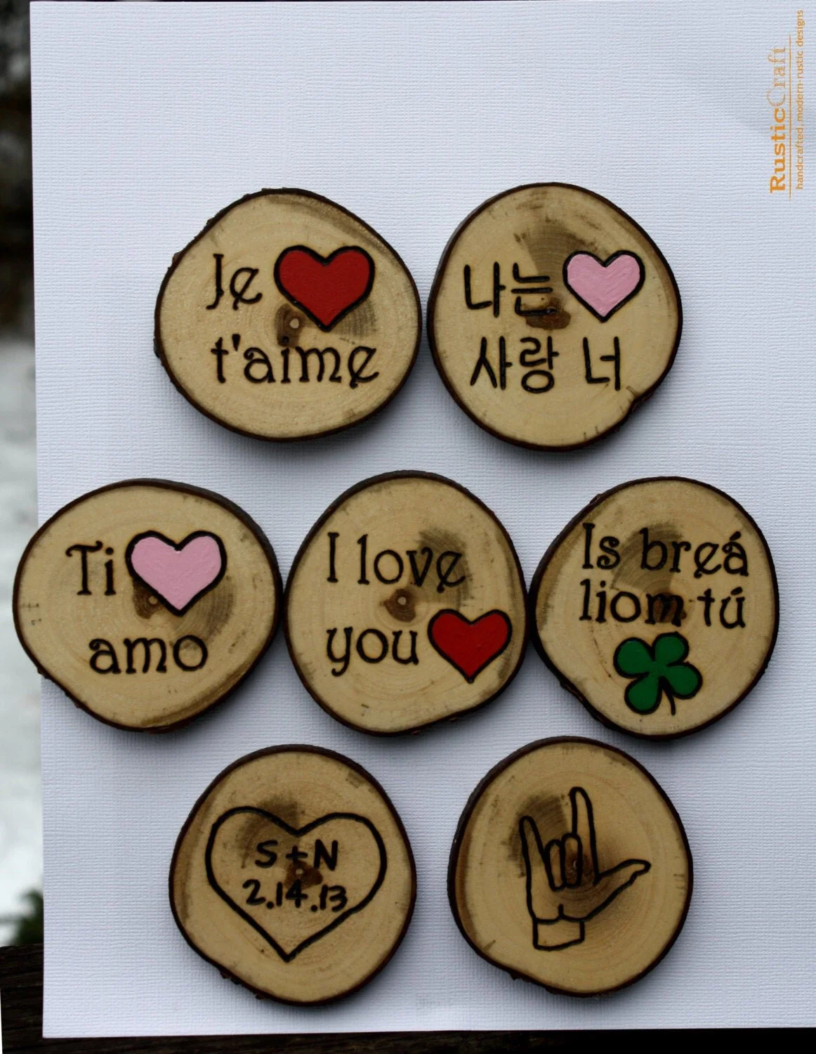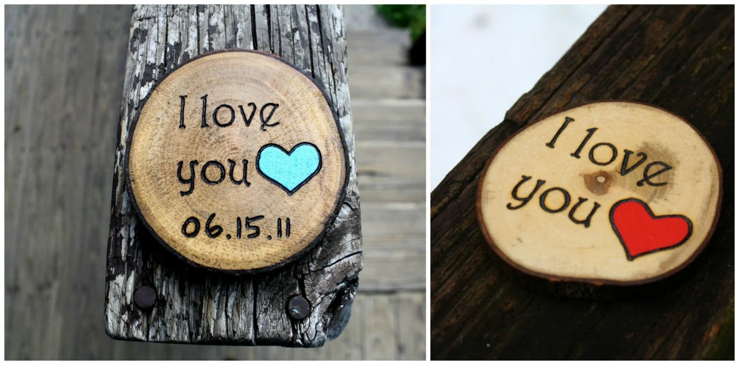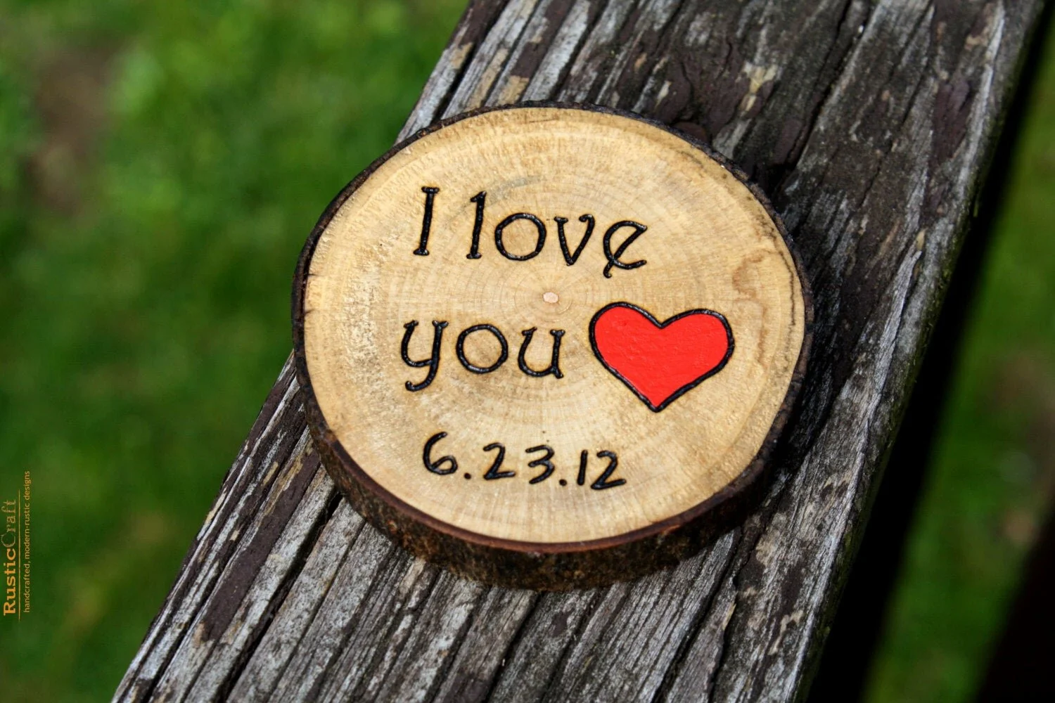 This listing is for a unique wood branch slice has been dried and sanded smooth featuring a custom engraving of "I Love You" with a heart of your choice of color or your choice of design on the front. (See the Personalization Section below).