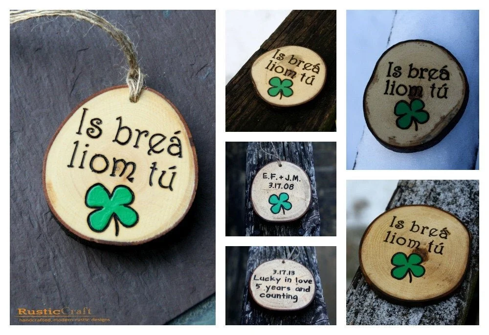 This listing is for a unique wood branch slice has been dried and sanded smooth featuring a custom engraving of Is breá liom tú which in Irish means "I Love You" with a shamorck (or heart) of your choice of color or your choice of design on the front.
